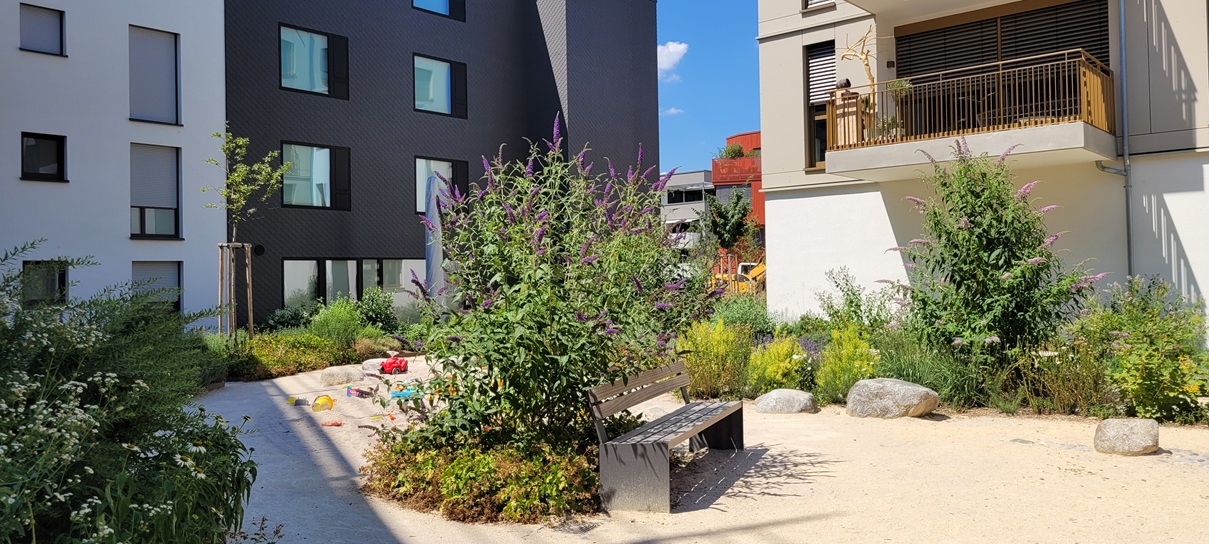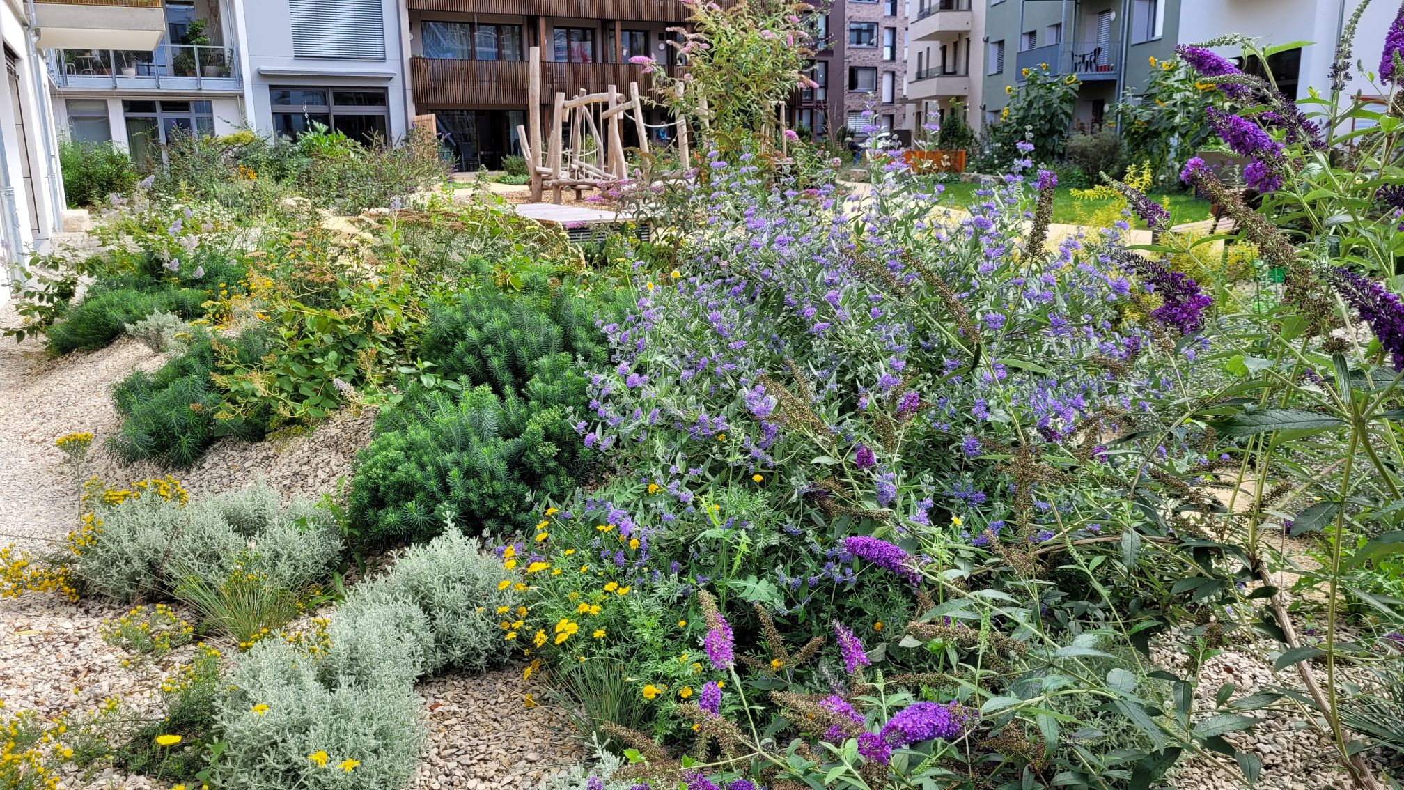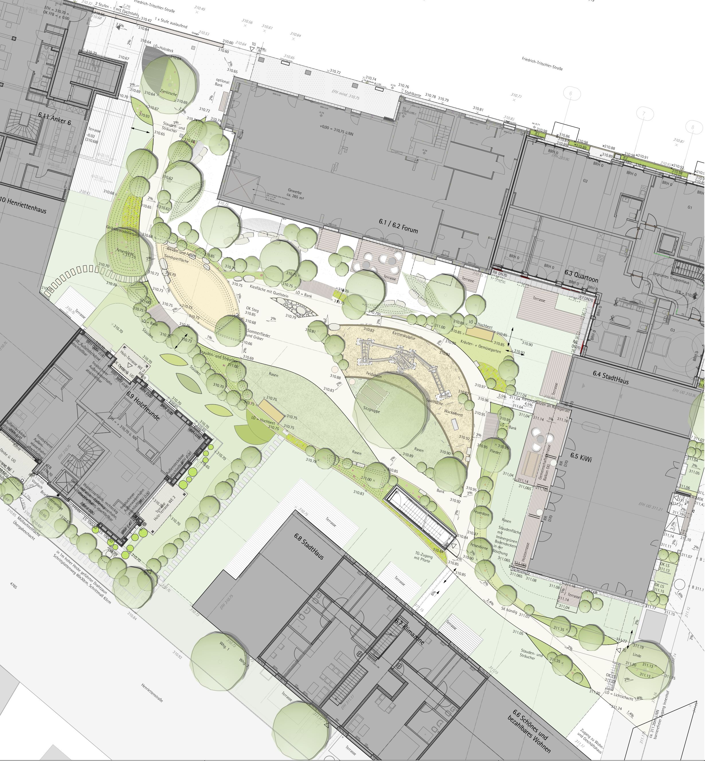 Weiche, landschaftliche Formen, die miteinander verwobene Flächen bilden und unterschiedliche Nutzungen haben. Der Übergang vom gemeinschaftlichen Innenhof zu den Privatflächen wird durch leichte Überhöhungen, Pflanzungen oder Einbauten vermittelt. Der Innenhof erhält so kleinräumige Spiel- und Aufenthaltsflächen, gepaart mit verschiedenen Sitzmöglichkeiten. Die Platz- und Zugangsbereiche werden in gleicher Formensprache wie der Innenhof gestaltet: mit Linsen als Pflanzbeete. Auch die Umhausungen bzw. Überbauungen der Lüftungsöffnungen werden in dieser Formensprache ausgebildet. Diese werden als Bänke, Hochbeet u.a. gestaltet. Geschwungene Wege führen durch das Zentrum, damit sie nicht zu bequemen Durchlaufstrecken werden. Eine Raum- und Nischenbildung entsteht durch in die Flächen eingestreute Einzelgehölze oder Pflanzgruppen sowie durch weitere Einbauten.