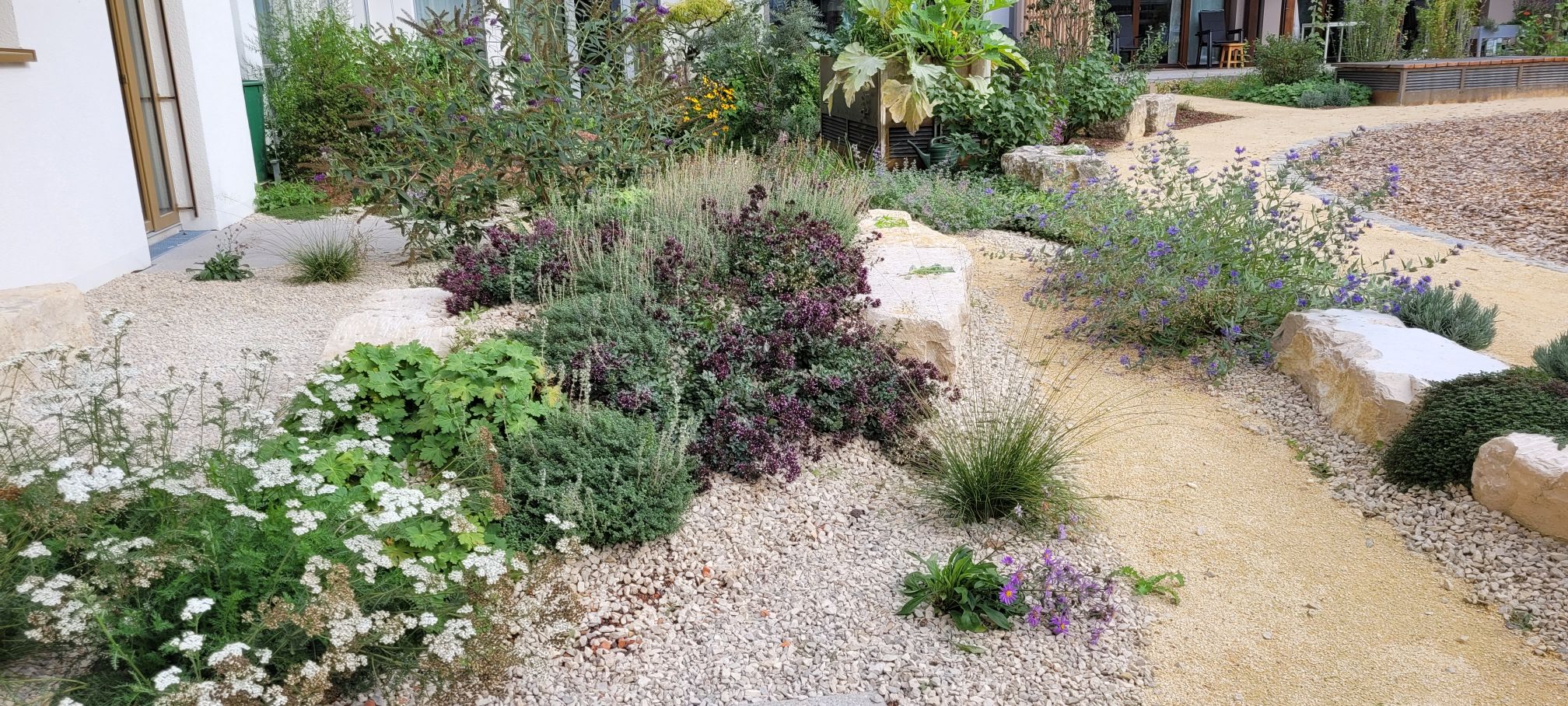 Im Zentrum der Gemeinde Bad Boll wurde von der Baugemeinschaft Neue Linde GbR eine generationenübergreifendes und integratives Wohnprojekt entwickelt. Im Haus 1 betreibt der Verein Arbeits- und Lebensgemeinschaft Bad Boll e.V. eine Dienstleistungswerkstatt und ein Cafe von und für Menschen mit und ohne Behinderung. Neben einer behindertengerechten Gestaltung der Freiflächen war der anthroposophisch geprägten Baugemeinschaft eine weiche 'natürliche' Linienführung in ihrem Innenhof wichtig. Entsprechend den Landschaftsbildern, die von Wasser und Wind gestaltet sind, formen Pflanzbeete die für die Bewohner zu nutzenden Flächen: den Garten mit Rasen und den Platz mit Kiesdecke. Die Cafe-Terrasse ist von einem erhöhten Beet eingefasst - als Raumkante und um den Höhenversatz abzufangen. Der Zaun aus Schmiedeeisen, der zu der alten Apotheke Linde auf dem Baugrundstück gehörte, wird zum berankten Sichtschutzzaun umgestaltet. Trotz eines geringen Bodenaufbaus über einer TG Decke beleben kräftige Präriestaudenpflanzungen den ganzen Sommer über den Innenhof mit einem tollen Blütenflor. Die Beete sind in aufeinander abgestimmten Farbkombinationen bepflanzt.