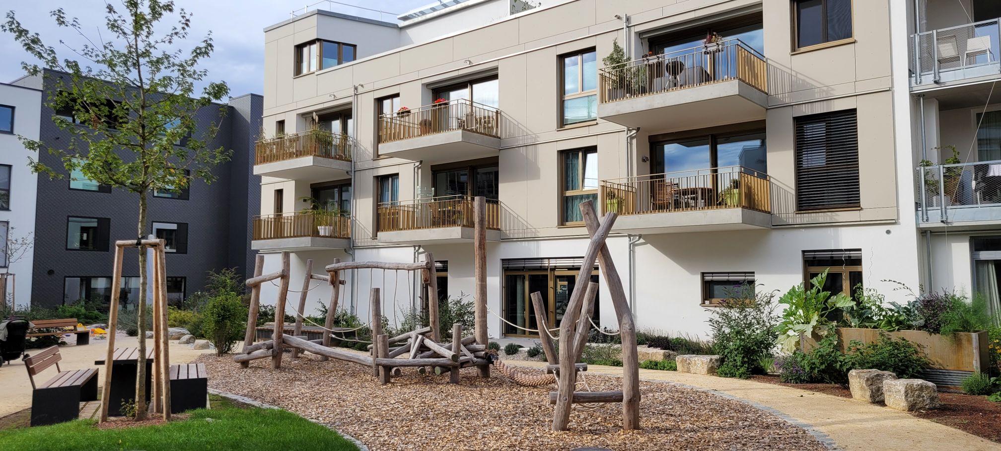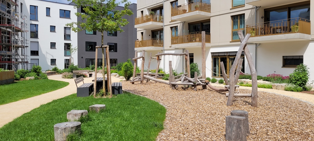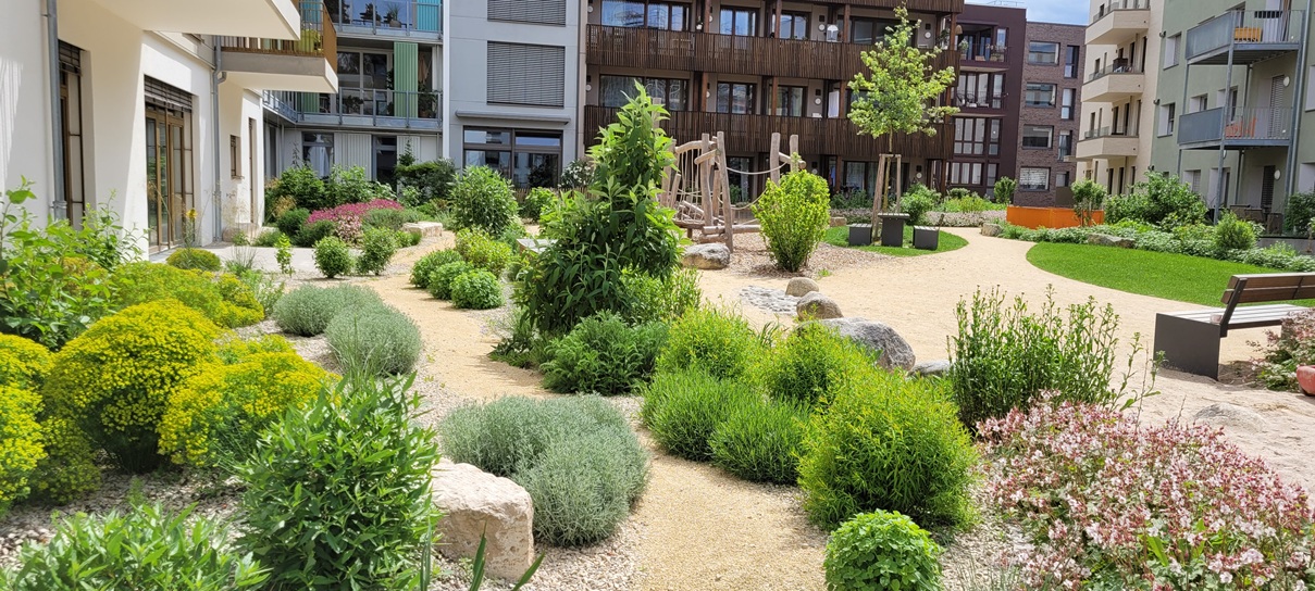 Im Zuge der Quartiersentwicklung in der Stuttgarter Straße wurden neben der Sanierung der Altbauten ehemaliger Kasernen durch Schließung der südlichen Blockränder mit Neubauten Innenhöfe definiert. Für den Hof 1 war es ein wichtiger